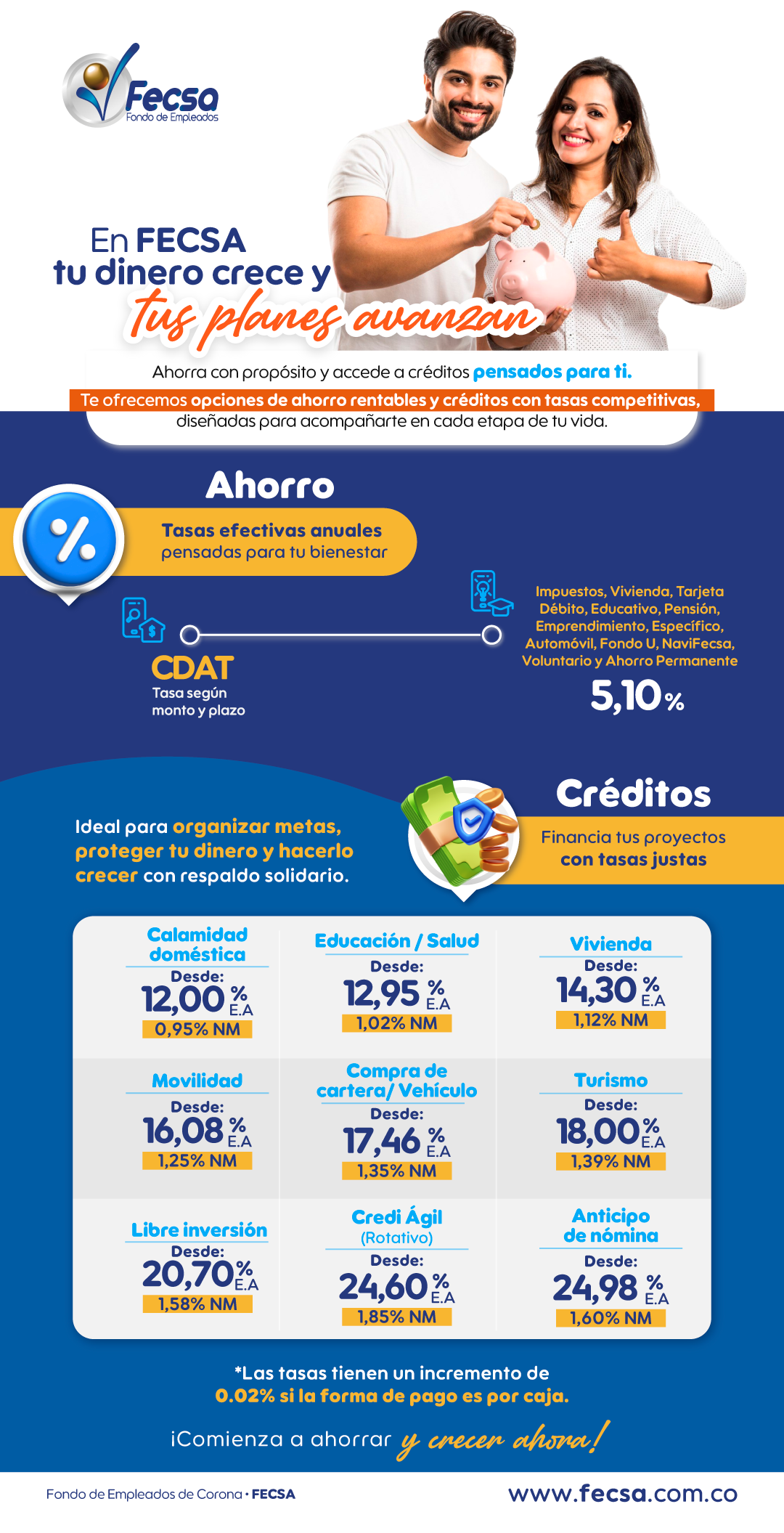 Es el producto financiero que permite cumplir metas que tengas propuestas, en Fecsa nuestro servicio de crédito lo vemos de manera integral con el servicio de ahorro, por lo que te invitamos primero realizar tu ahorro y luego obtener un crédito accesible con tasa competitiva, plazos amplios y lo mejor, pago a través de tu nómina.